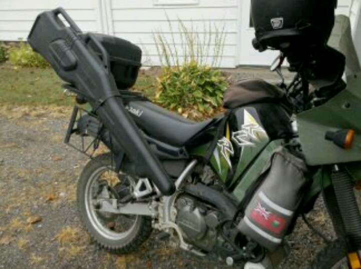 A mi club de tiro tambien va un tio en una moto de esas grandes BMW que lllevan atras dos maletas gigantes metalicas, una a cada lado, y sobre las maletas lleva los rifles atados y no le ha pasado nada.