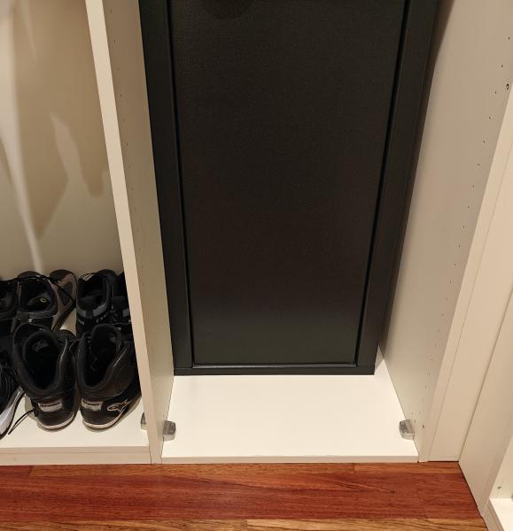 Lo que yo haría, de hecho es lo que hice en mi casa, sacas esa madera del armario y el embellecedor ese que parece un zócalo, montas el armero y lo anclas al suelo de hormigón, recortas la madera a la medida que te queda con el armero puesto y la vuelves a colocar.