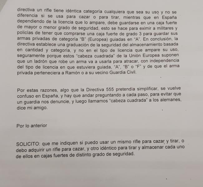 LO demas son opiniones que el ORGANO no tiene obligación de tener en cuenta, asi que pueden eliminarse de la ecuación, pero la pregunta sigue ahí: ¿tengo que comprarme dos rifles idénticos, uno para cazar y otro para tirar, y guardarlos por separarlo, uno de ellos en armero de grado 1, y el otro en caja fuerte de grado 3?