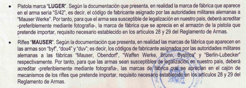 Por último respecto a la pistola Luger S/42 y los rifles K98, los códigos descritos en la carta de esta ICAE son códigos militares alemanes, bien reconocidos por la misma, que sustituyen a las marcas de los fabricantes mismos hace más de setenta años. La importación sin nuevo punzonado es admisible por el Reglamento de Armas en virtud de la protección de Patrimonio Cultural Histórico, regulado para armas de una antigüedad de entre 50 y 100 años según Reglamento (CEE) nº 3911/92 del Consejo, de 9 de diciembre de 1992, relativo a la exportación de bienes culturales.