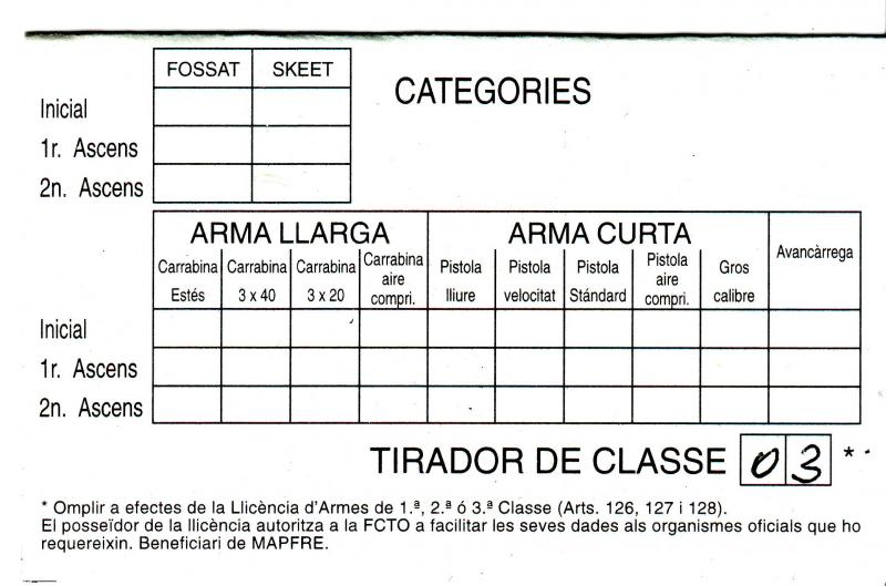 La licencia federativa (no la de armas), pone que soy categoría deportiva tercera. Y eso desde que sólo tiraba en aire.
