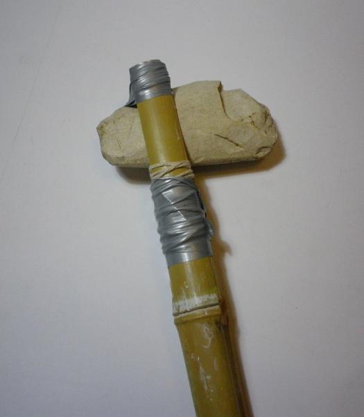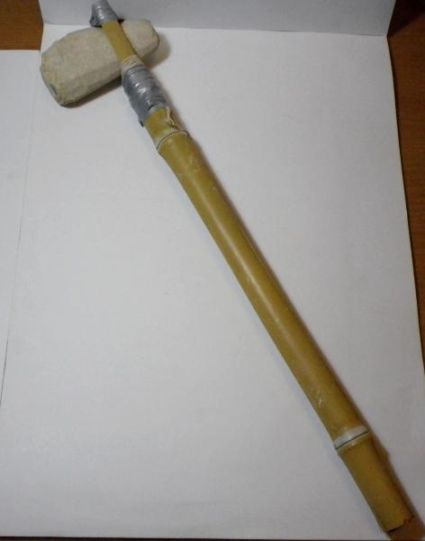 Hola, llevaba ya tiempo dandole vueltas a la cabeza la idea de hacerme un tomahawk, pero como no domino la forja (lastima no haber tenido oportunidad de aprender el oficio pues mi abuelo y mucha familia atrás fueron del mismo, e incluso 2 primos segundos mios aún tiene una "fragua" pero cada vez más dedicados a los aluminios...)pero dentro de mis aficiones es ser coleccionista de utiles prehistóricos y fósiles, entre otras muchas...y tenia por casa desde hace varios años un hacha de piedra (silex), mejor dicho "hachuela" del Neolitico (5.500 años a.C.)europeo; total que he pensado hacerme un stone tomahawk lo mas parecido a los originales...he pillado unas tiras de cuero negro que estaban muy secas y las he puesto blandas con grasa de caballo, las tengo dentro de una bolsa para que se impregnen bien..y con una caña de bambú, india como decimos pòr aqui, que son muy duras y a la vez flexibles, me estoy haciendo este "arma terrible"...estoy en el paso primero como vereis le he puesto una cuerda y cinta aislante para que vaya tomando forma,la piedra dentro de la caña; tambien a la parte de la caña que sujeta la piedra le he puesto un poco de pasta adhesiva; mañana le quito esto y procederé a atarla con las tiras de cuero; voy a pillarme unas plumas en la tienda de los chinos y con una piel de conejo y alguna cosa más que tengo haber que me sale...os adjunto las primeras fotos...cuando la tenga terminada pondré el resto.Disculpad el ladrillo.