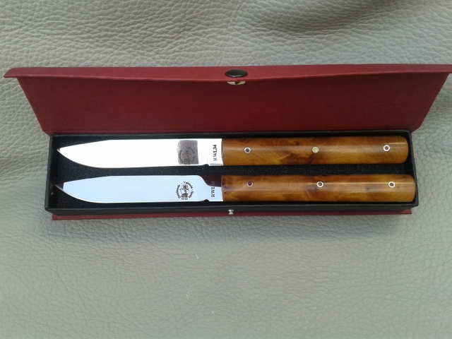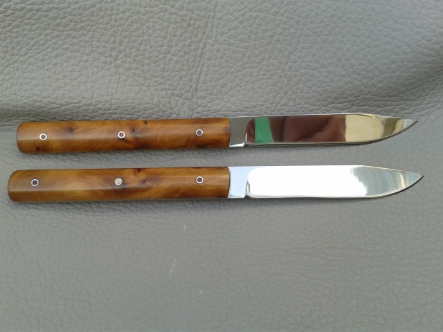 Juego de cuchillos de mesa, realizado en acero inox. RWL34, y encabado con Raiz de Thuya.
