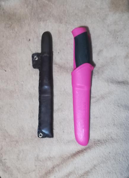 La funda es muy minimalista, en cuero y con vaina rígida de plástico interior para la hoja. Así, aunque la hoja es en tamaño como la de un Mora robust o companion, el cuchillo ocupa realmente poco y facilita mucho el porte. El cabo, si bien fino, por longitud da un buen agarre.