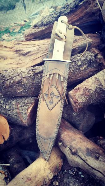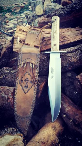 Hola. Dejo aquí fotos de un bowie Cudeman que me pasó un compañero del foro y que he encabado y acabado con asta de reno, madera y cuero. Un saludo.