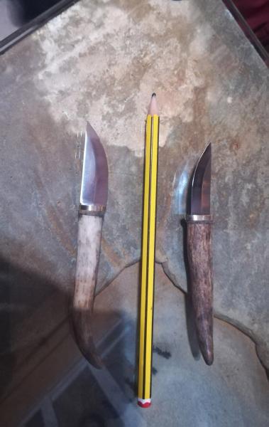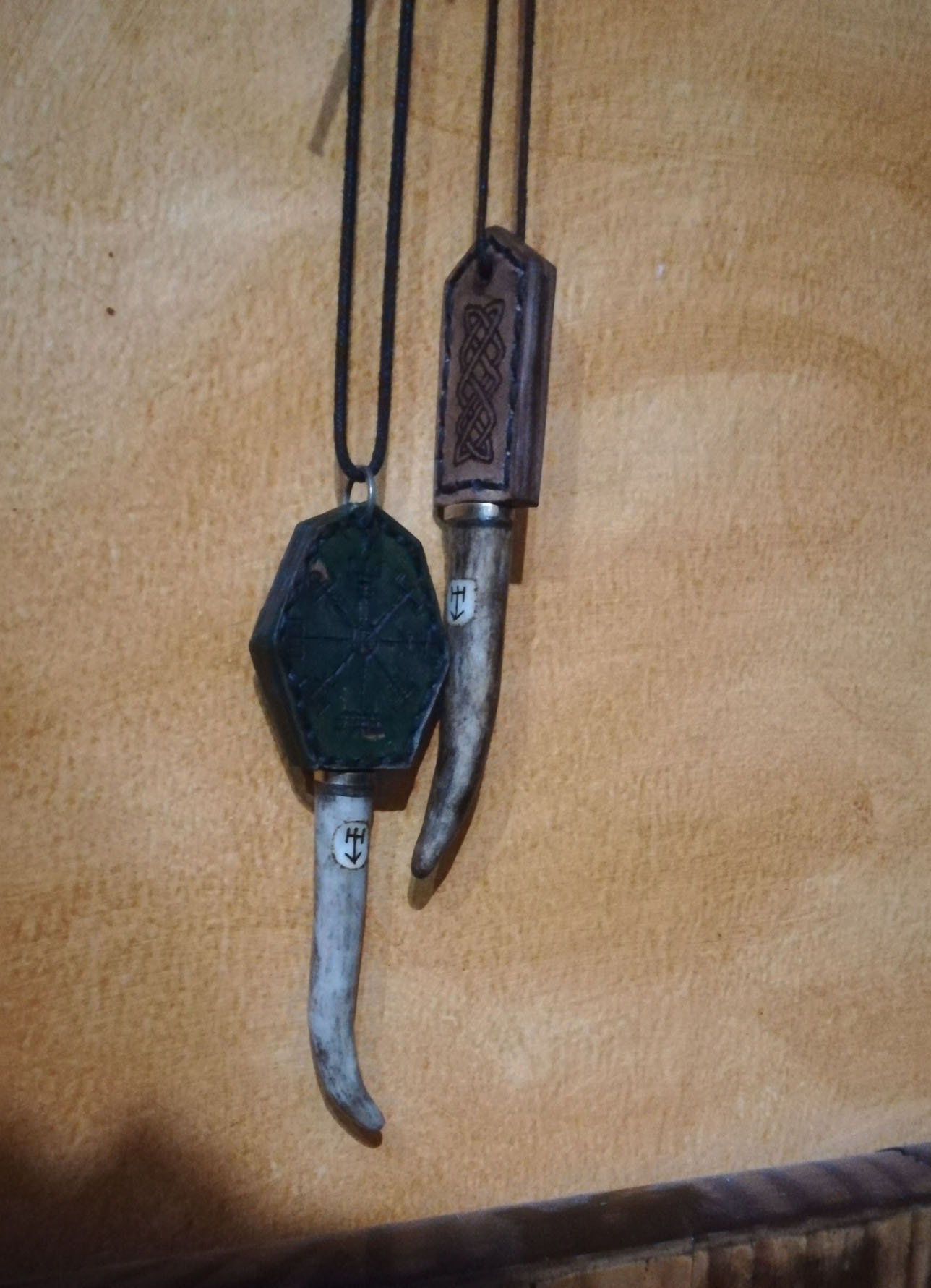 Así, han salido estos dos en punta de reno. He grabado una runa en cada uno (no runa de escritura, sino runas "mágicas" o talismánicas). Acorde con el tema nórdico, que es de donde vienen los materiales de ambos. La runa en cuestión es la de protección en el viaje, entendiendo este a veces como algo más que un desplazamiento.