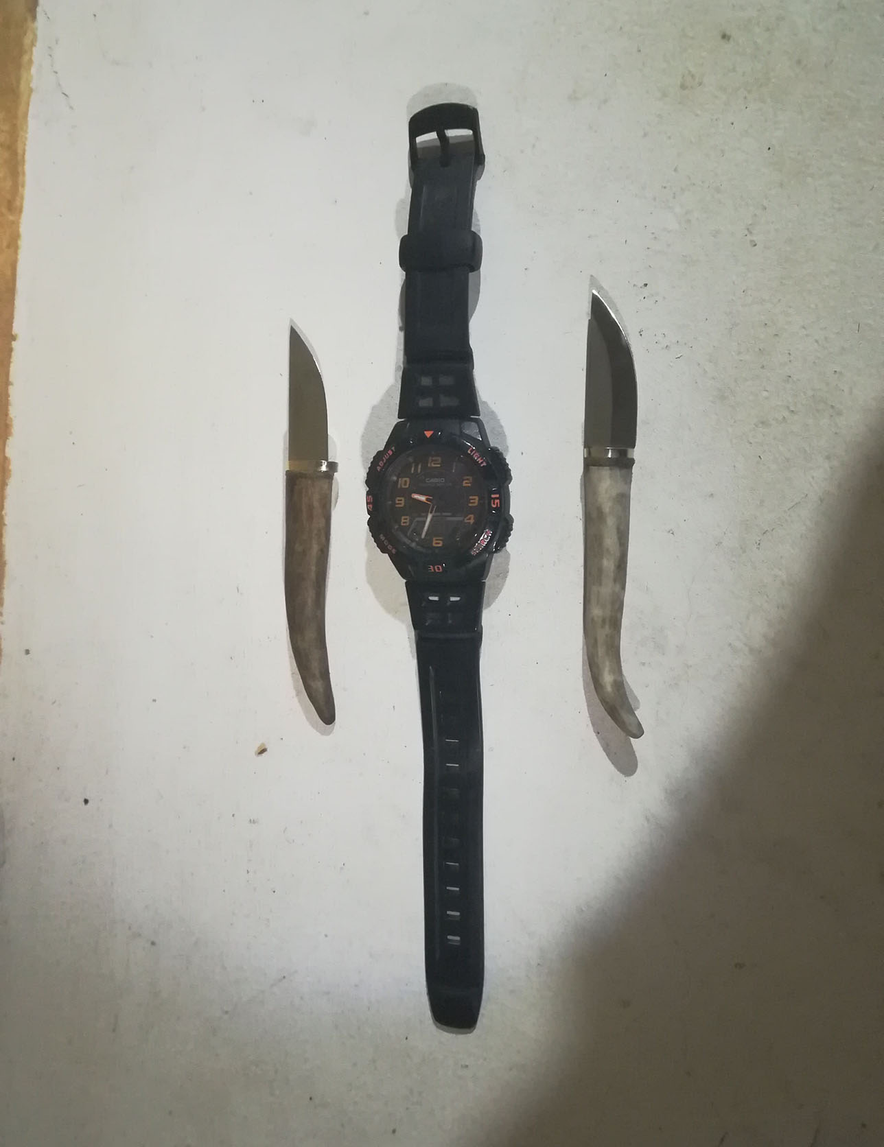 Hola. Tenía yo ganas de meterle mano a las hojas Lauri en 4,2 cm, esas de cuchillo de cuello o de bolsillo. Y con un par de ellas, he hecho estos "micro-puukko". Lástima que no hubiera bolsters para esa medida de hoja. He tenido que hacerlos y ha sido una currada. He usado chapa de latón de 3 mm, cortada, taladrada, limada... Vamos, como hijos tontos.