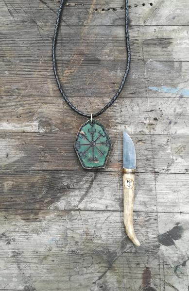 Van pirograbadas. Una, con un motivo decorativo. La otra, con Vegvísir, el compás solar y la runa Raido (o Raidha) en el centro (más alusiones al viaje...)