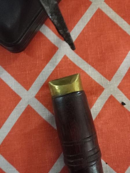 Parece que la espiga y el mango estaban simplemente encolados. No sé si el kukri es original asiático, pero ese tipo de enmangue encolado es muy habitual en la India y alrededores, y es sorprendentemente resistente. Los talwar están montados así, utilizando unas colas tradicionales que ellos preparan, y es increíble como soportan las exigencias de un sable de combate. Yo tuve hace tiempo el de las fotos, que tenía la hoja maltratada de filo y lomo, sospecho que en batalla, y sin embargo la empuñadura estaba absolutamente firme.