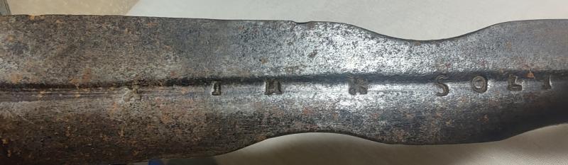 La hoja es alemana, lleva las inscripciones GIO KNEGT de un lado, y del otro IN SOLINGEN, ambas leyendas entre marcas similares a una X o asteriscos, y luego de SOLINGEN, una marca similar a un ancla Hall horizontal.