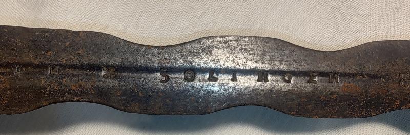 De todos modos, jamás he visto esa combinación de la guarnición reglamentaria de caballería del modelo 1728 con una hoja flamígera. Por las marcas que indica, típicas de ese espadero de Solingen, sí que podría ser contemporánea, pero eso no excluye una posible recombinación por parte de un anticuario o coleccionista "creativo".