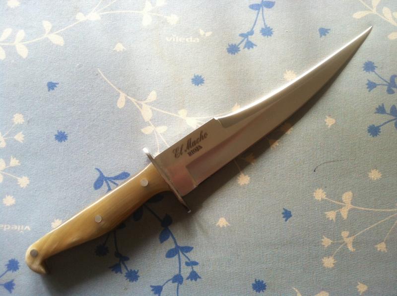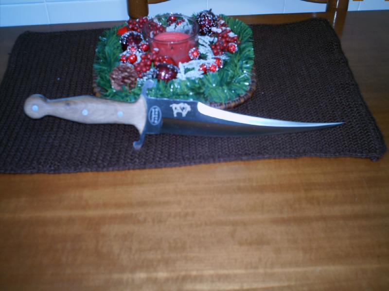 Pues os pongo unas fotos del mio,porque es un cuchillo que me encanta, hace algun tiempo que lo tengo, pero todavia no he visto ninguna foto de los que lo estais comprando nuevo como el mio, los vuestros tienen la guarda normal y corriente, vamos, la tipica pieza de acero independiente de la hoja, en el mio forma parte de ella, o sea, la hoja y la guarda son una misma pieza, asimismo las cachas del mio son de madera, tampoco he visto ninguno así, a pesar de que en el certificado pone que pueden ser de maderas nobles o de otro producto, como el asta de toro.