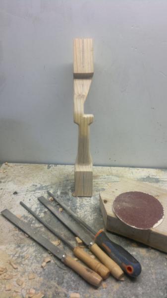 La empuñadura esta hecha a partir de un fondillo de madera de los que se usan para encofrar, primero diseñe una plantilla en carton y cuando me convencio lo pase a la madera, despues cortar con la caladora y de ahi en adelante limar para dejar todo bien a escuadra, formon para desvastar las formas y lijar a mano y con paciencia hasta dejarlo decentemente terminado.