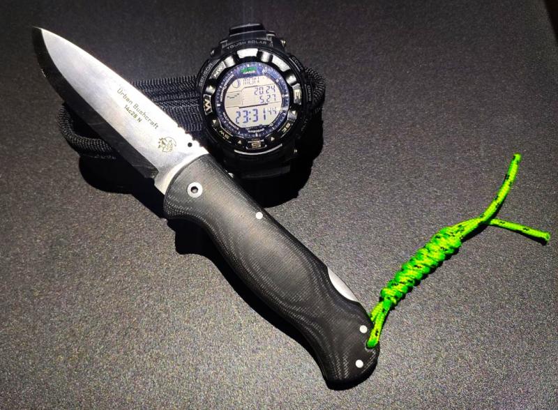 En estos momentos para salir al campo estoy usando una navaja J&V modelo Urban Bushcraft con filo scandi y 9,5cm de hoja. Originalmente lleva un tetón para apertura a una mano, pero como el muelle va duro, no se puede abrir a una mano, así que se lo he quitado.