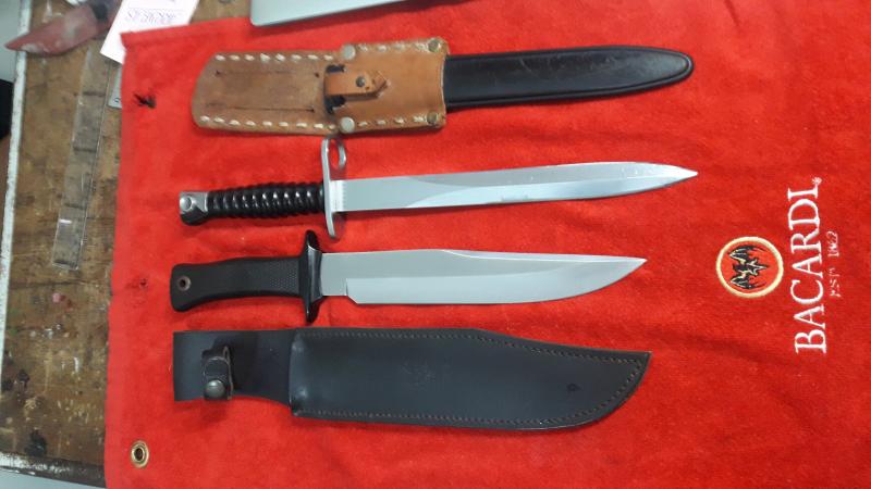Pues hay tres muelas,uno de remate de doble filo que el modelo caribu,es una serie especial en hueso y firmado,un gredos que es mi compañero de monteris y uno que regalo la revista armas y municiones hace años ya.una bayoneta suiza a la que le fabrique un tahali y uno artesano y otro que no se la marca pero es una bestia y la funda es de piel de venao,que tambien me ha acompañado algunas veces.
