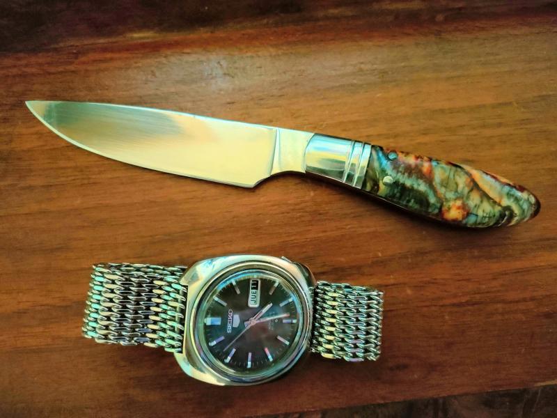 El reloj poca explicación tiene. El cuchillo es uno de esos de "gentelmen" de Fermosos Fierros inox con muela de mamut estabilizado, cuando lo saco en un restaurante me miran mu raro.....pero todo el mundo pregunta