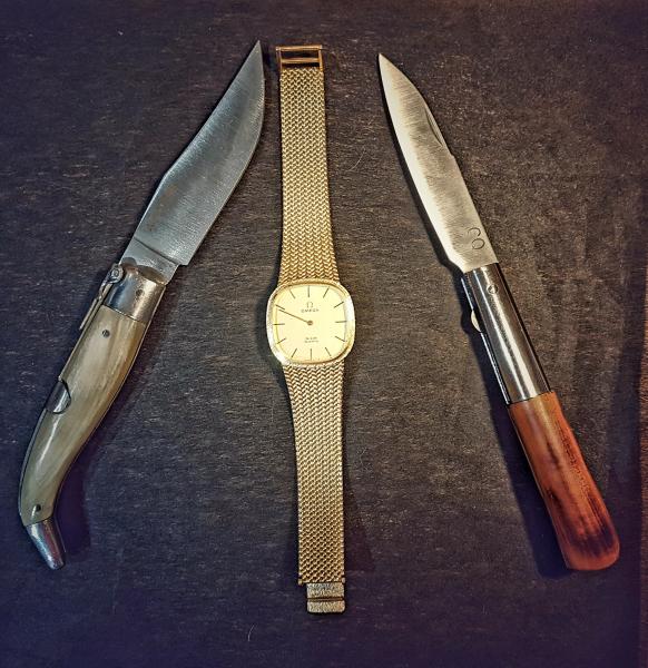 Contrastes: las dos navajas, de Albacete y Taramundi, que suelo llevar al monte, y un reloj que llevo poquísimas veces y que es, a fecha de hoy, mi posesión más preciada, el Omega de oro que heredé de mi padre