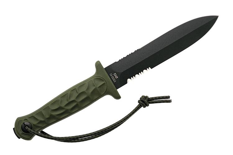 -La hoja tiene unos acabados superiores, corta que afeita, integra filo liso junto a perlado con el fin de abarcar el corte, y llegado el caso incluso el aserrado de plexiglas y/o aluminio de fuselaje. La punta de la hoja, en esta concreta configuración, está diseñada para optimizar y conseguir una gran penetración, manteniendo al mismo tiempo la robustez de la misma.