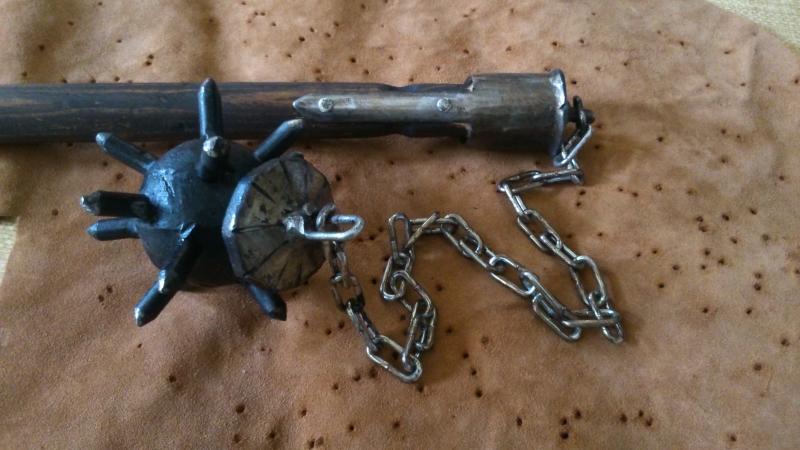 hola . te cuento una anecdota , ahora que te he visto esa maza de bola , pues resulta que de chaval me hice una para adorno , aprovechando la parte de arriba de un viejo gancho para persianas metalicas que era de madera coronado por un cilindro de acero , al que solde una cadena y una bola de acero que encontre en una chatarreria , pues el trasto estuvo colgado mas de veinte años , asta que un dia entro un rumano a robar a la lonja y como no se corto en dar ruido le oyo mi hemano , llamo a la policia y le detuvieron , al ver la policia la dichosa maza le dijeron a mi hermano que era un arma prohibida y que solo puede ser expuexta en museos y que si yo era neo nazi ? ....