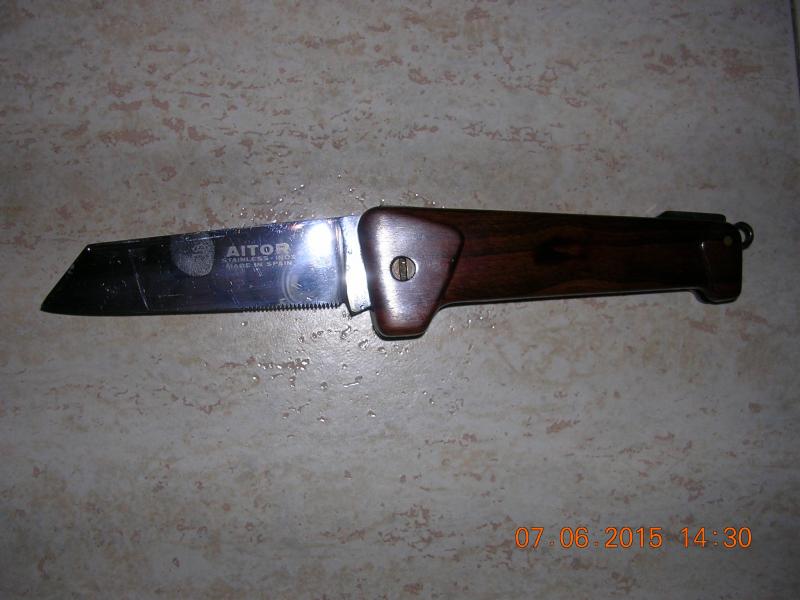 Ayer un buen amigo del Club y eminente cirujano, me regaló esta navaja, es una Aitor Cazador prepielcu, está sin estrenar, la mancha que se ve en la hoja es de uno de mis dátiles.