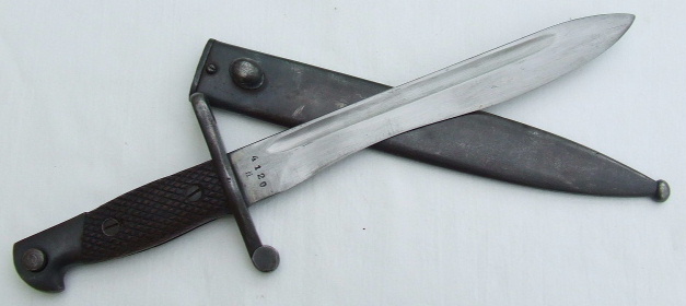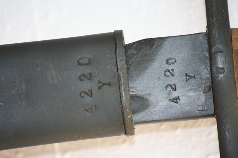 el numero de serie 4220 de la serie "Y" la sitúa ya bien avanzada la producción ( 274.220 ??!! si la numeración era de 10.000 por letra )....es posible que si se hayan fabricado tantas puesto que del Mauser M1943 (al que iban destinadas, con adaptador) se llegaron a fabricar 500.000 ejemplares .....también , el fosfatado ("parkerizado") de la hoja, vaina, cruz y empuñadura , no creo se estilaba en los años 1940 en las armas Españolas (aunque en las Americanas si)....lo pensaría mas propio de los 1950 ...pero solo especulo, en realidad no lo se.......según Barcelo (2a edicion) todavía se fabricaban en 1949 y 1950........el Máuser lo fue hasta 1.955......Pero quizás me equivoco por completo......a falta de prueba documental no se puede afirmar nada con seguridad.