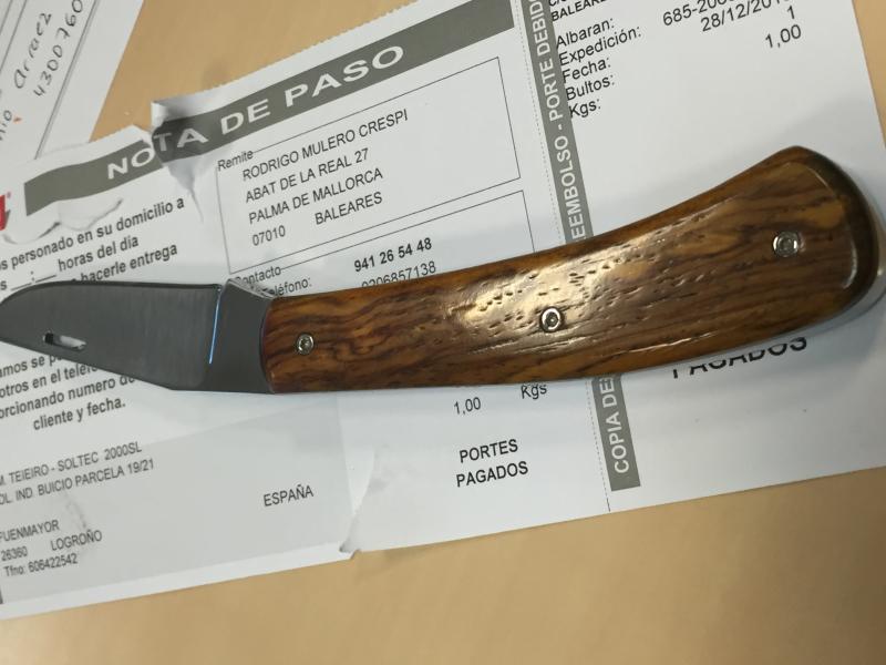El primero, la hoja no corta nada, me tocará ponerla en manos de quien sabe hacerlo bien para no rayarla lo más mínimo. De la calidad del encabado no está muy allá, estoy viendo otras con el veteado mucho más marcado pero entiendo que no todas pueden ser iguales. (comparada con el veteado de otro Compañero, nada que ver)