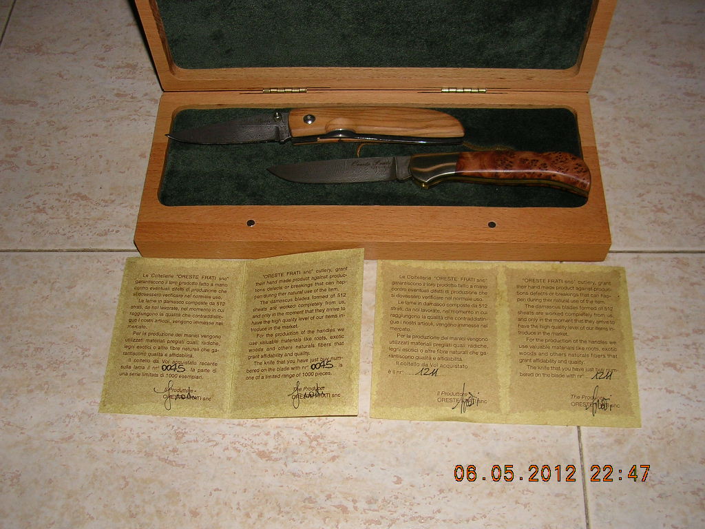 Una cosa es damasquinado y otra acero de Damasco, yo tengo varias piezas, todas buenas, entre ellas dos navajas Fox Oreste Frati de 512 capas martilladas a mano, te pongo fotos para que veas lo que es acero de Damasco, todos los cuchillo son Irlandeses menos el de la derecha es de Damas (Siria).