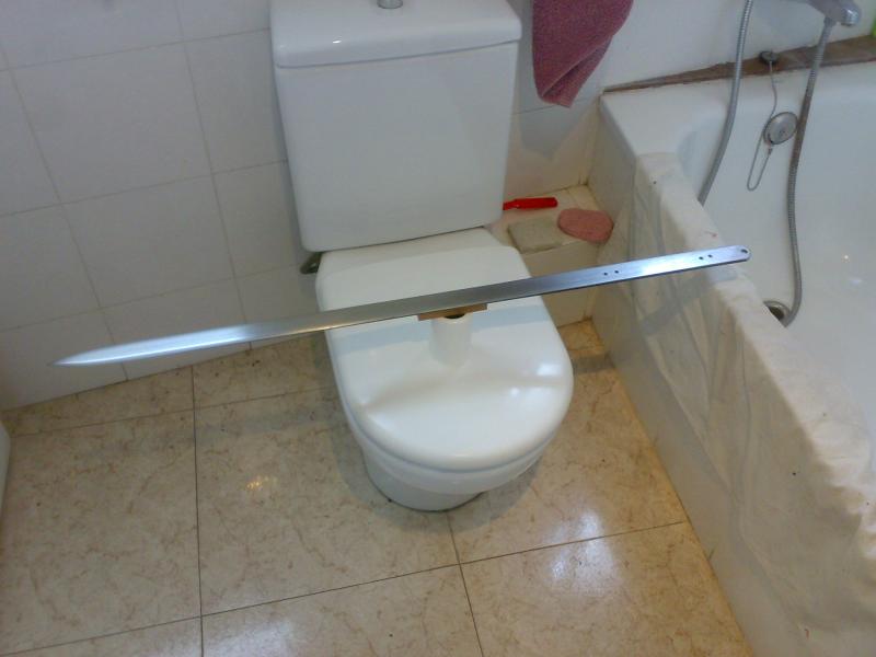 Está hecha con "acero de pasamanos" como se le dice vulgarmente. Son esas pletinas de acero que venden en centros de bricolage, en trozos de un metro. Y no le voy a dar tratamiento térmico. Además, tengo entendido que éste tipo de acero con poco porcentaje de carbono no coge buen temple. Por tanto es poco mas que decorativa.