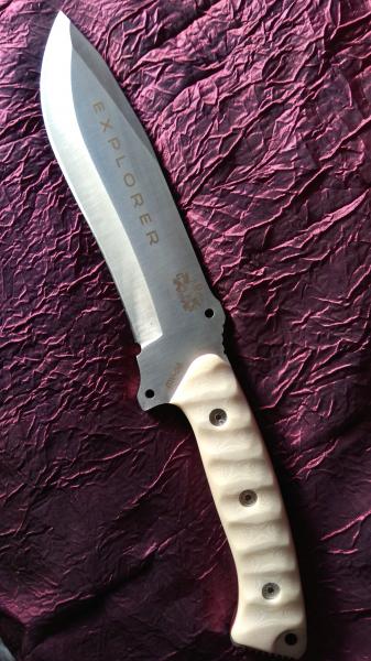 El explorer con micarta blanca y separadores rojos,la funda de cuero,me gusta más que la cordura,que os parecen estos hierros?Feliz 2018