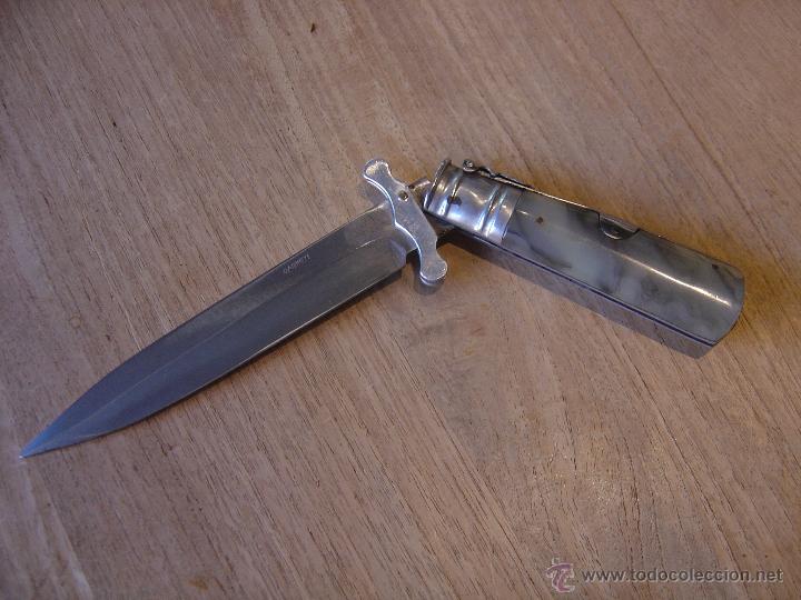 Es de los pequeños, con unos 14 cm de hoja, ligero y manejable. Cierre de palanquilla y cachas de nacarina. (sigue)