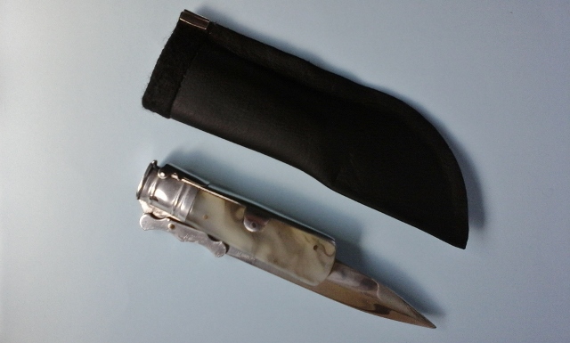 En la imagen siguiente, con una funda de cuero fino que le hice yo mismo... estos cuchillos la necesitan, dado que una parte de la hoja siempre asoma. La original se perdería hace años: