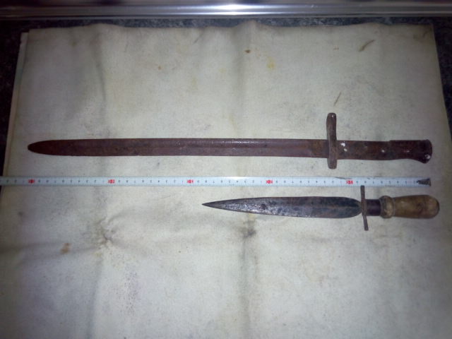 Hola han caído en mis manos lo que creo que es una bayoneta máuser 1913, aunque los marcajes no se ven bien y no se de que año es y un cuchillo de las coes de primera generación, pero con ellos también una especie de daga y sobre esta son mis dudas, no se si es algo real o un abrecartas o algo ornamental, pongo fotos y pido la ayuda de los expertos