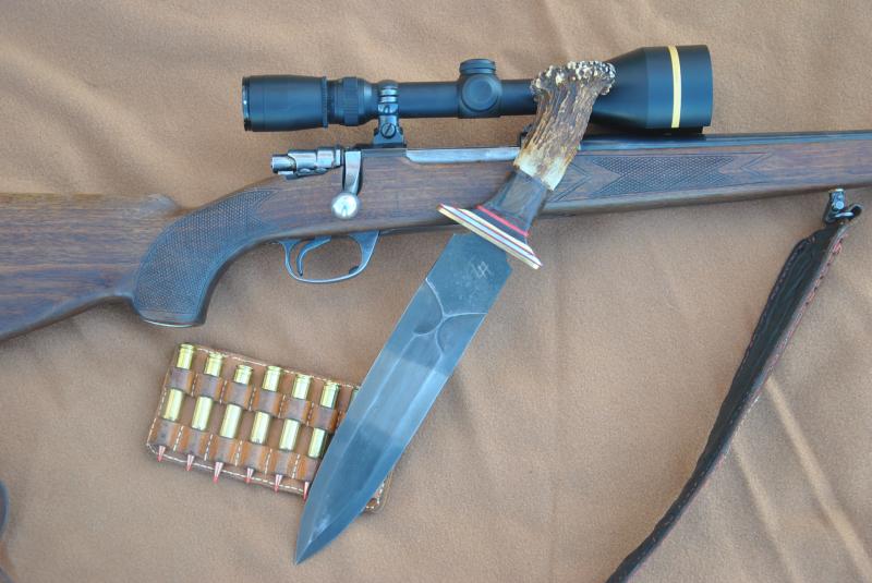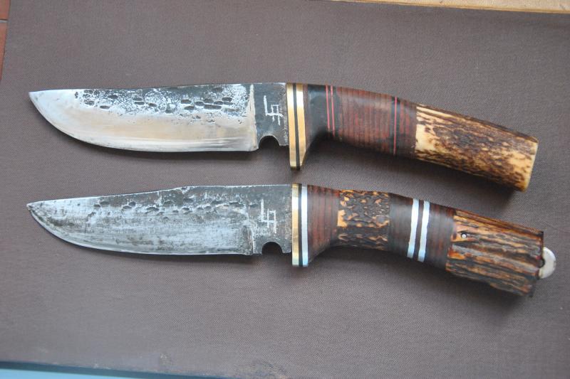 Estos dos son forjados de espadin de motosierra, de unos 12 cm.de hoja por 3cm. de ancho y 5 mm. de grosor, los cabos en ciervo corriente con arandelas de cuero, aluminio, laton etc.