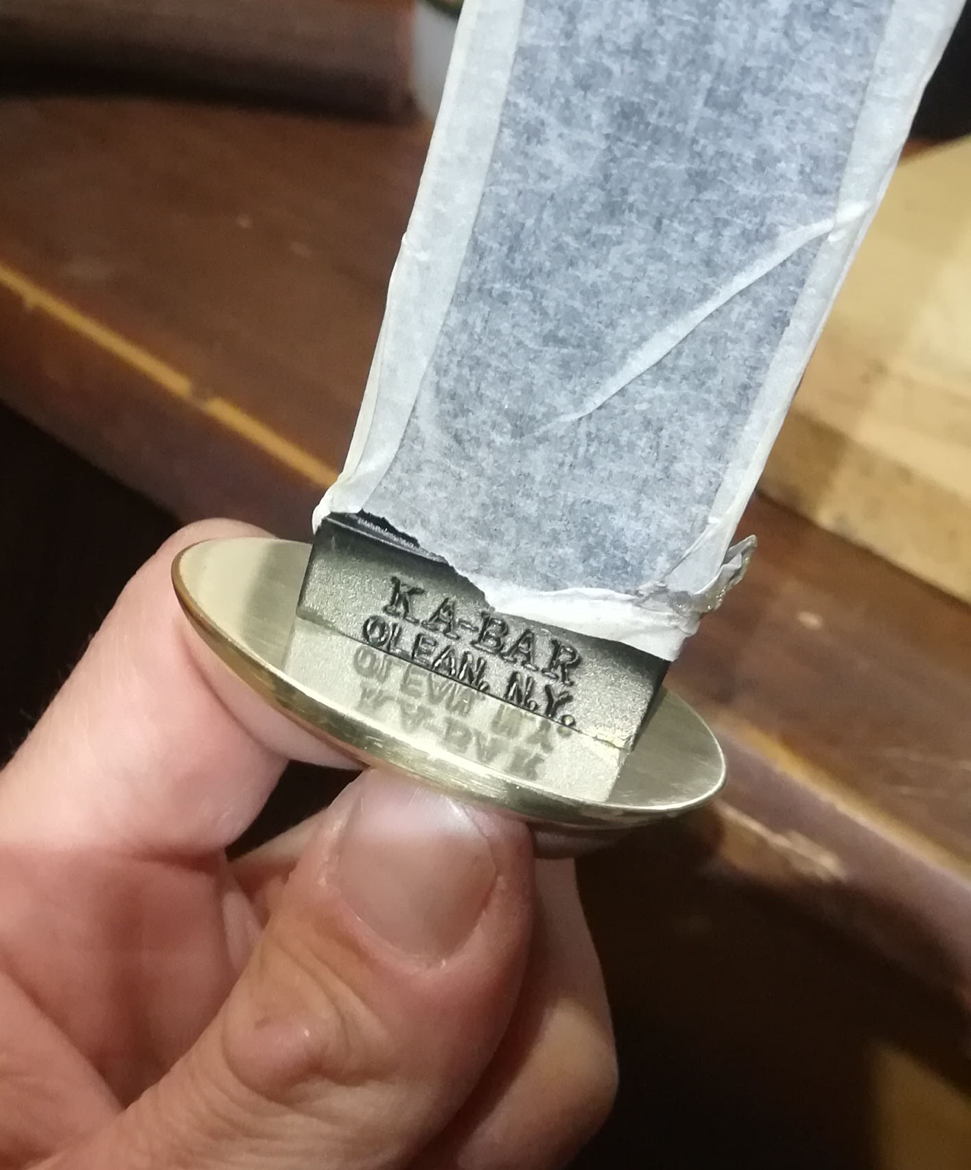 Realmente, sólo he subido por la hoja unos 5mm, con lo que aún se leen los logos de ka-bar y USMC y todo eso. Vamos, que la hoja, de 7 pulgadas, no pierde mucho en longitud. Sigue habiendo hoja de sobra.