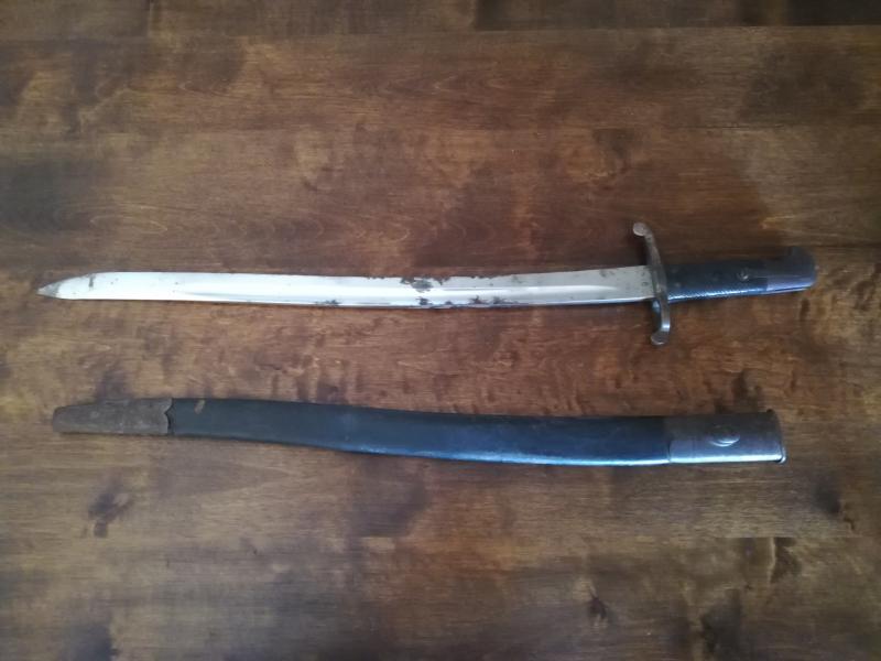 Un compañero (gracias, Juanjo!) la ha identificado como una bayoneta tipo yagathan. Por empuñadura, acabados y falta de cuños, parece ser del tipo destinado a uso privado, según un listado ilustrado que corre por la red. Lamento no recordar el enlace: