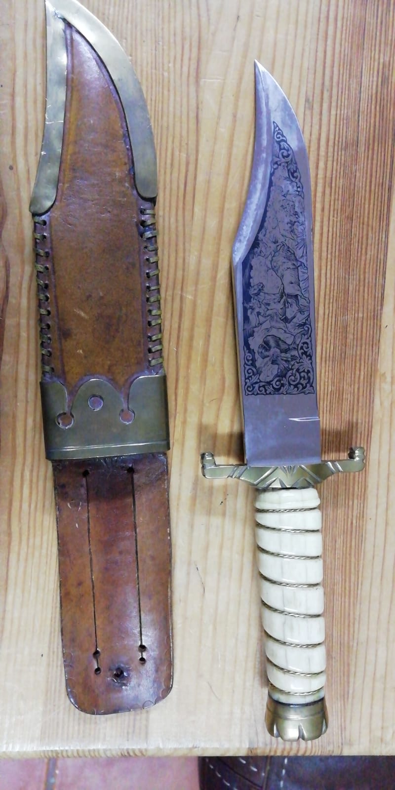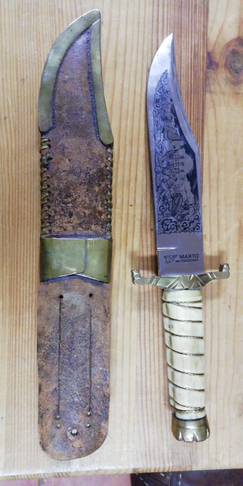 este cuchillo de base se fabrico en marto en los años 80,lo único que esta customizado el original es el pomo y guarda liso la funda es lisa y el puño de madera ,tengo las imágenes del catalogo de marto en el que aparece por si quisieras verlo ,un saludo