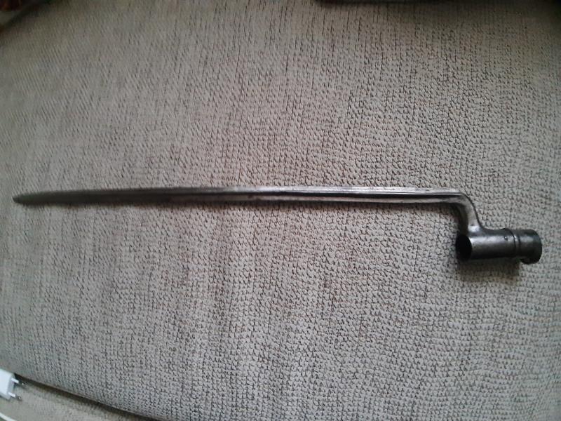 Hola,recientemente he adquirido esta bayoneta de cubo y no se su procedencia. Por si alguien pudiera indicarme. Mide 42cms de hoja,48,5 total y el diámetro es de 2,2cms. Gracias de antemano.