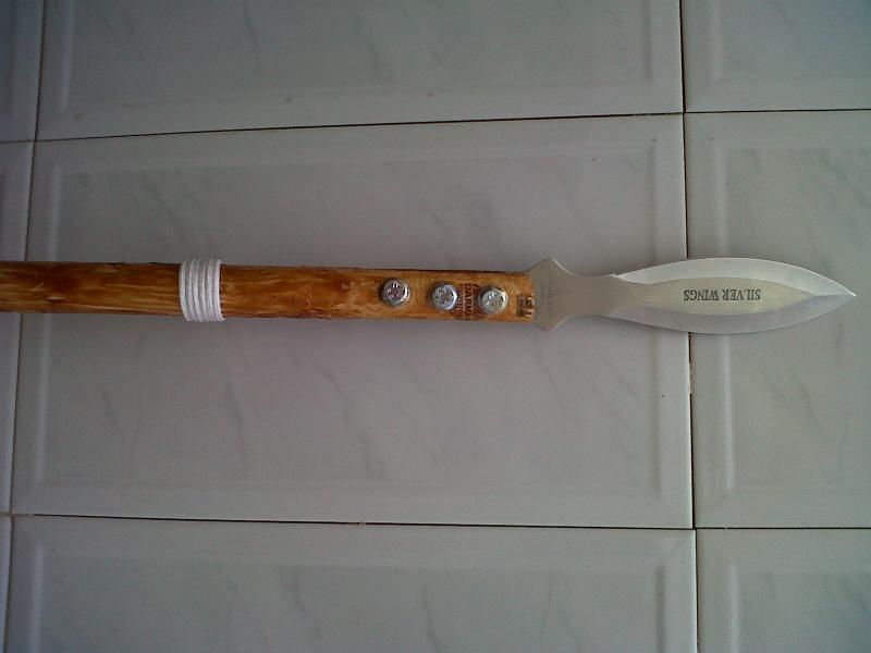 El lunes ire a Leroy Merlyn, comprare un "palo" de madera (ese tipico palo largo con forma cilindrica que llevan los cepillos de escoba, rastrillos de campo,etc...) escogeré uno suficientemente grueso pero ligero.En un extremo le haré un surco, en el cual introduciré un cuchillo de lanzar que tengo, todo irá bien sujeto, pegado, y exteriormente prensado con piel.