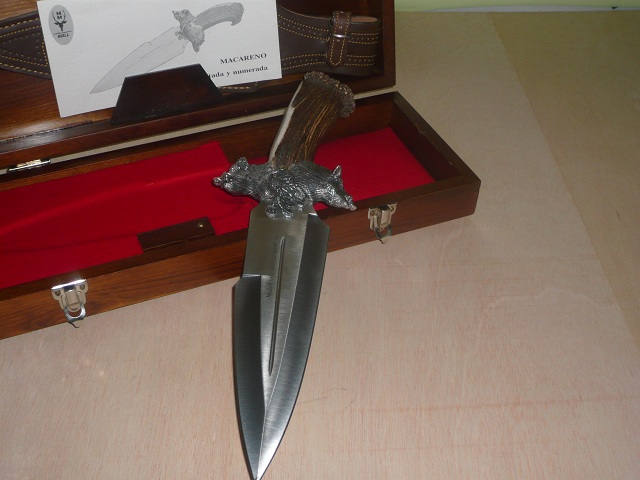 hola buenas,aqui os presento un cuchillo de la casa muela.es el muela macareno,es un cuchillo de remate de edicion limitada a 500 unidades,y descatalogado,cuando lo empuñas, es un cuchillo que transmite bastante poder,para mi es un cuchillo bastante elegante.el macareno es basicamente un gran duque,cuchillo que me fascina mucho,tengo todas las versiones de el.lo que lo diferencia del gran duque es la guarda,que son dos macarenos labrados en plata.bueno, no me enrollo mas que esto no es lo mio.mejor mirar.un saludo