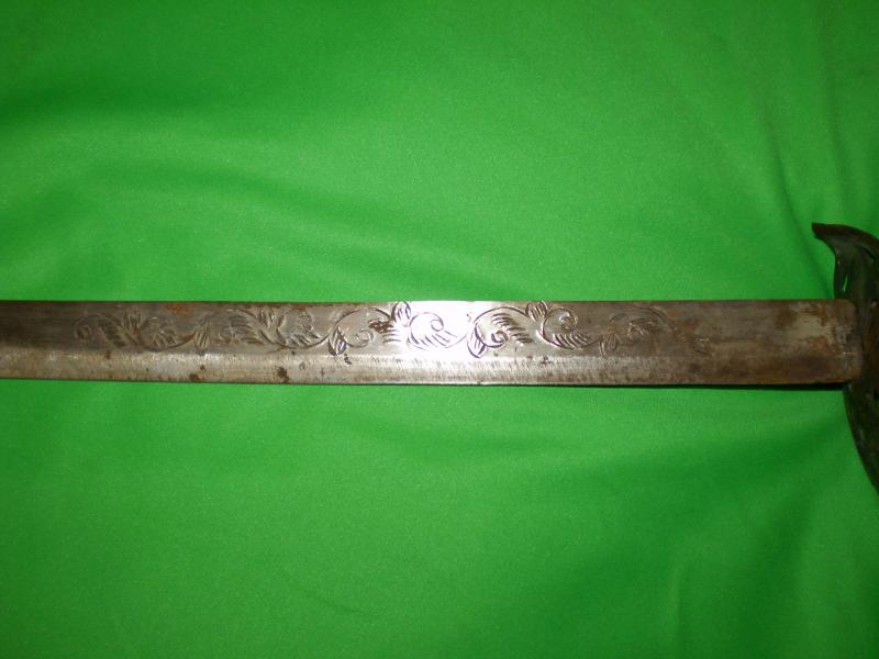 Por los dibujos y forma de la hoja ,diria que es del 19,o,principios del 20,de origen ingles y con influencia colonial.seria interesante ver la forma de la punta de la hoja.Saludos.