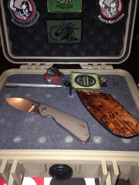 Yo conseguí esta sin funda ni skull pero con el tiempo localice esta funda de Gregg Everett que a pesar de no ser la original de este conjunto es bien chula. El skull de stalingear es una asignatura pendiente. La rabiza es de mi amigo Querosan y el skull dorado una edición especial 2006 de emerson.