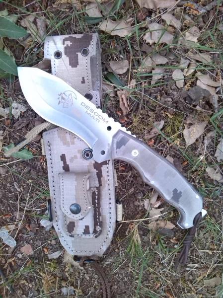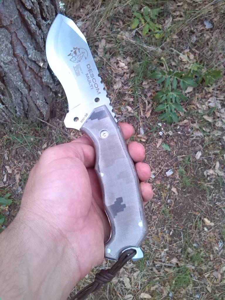 Este es el Descon 1 Multiherramienta (existe sin ella) en acero Mova58, puño en micarta lisa camo (al principio me parecía G10) que aún en mojado se agarra perfectamente, funda de cordura con enganches tipo Molle para acoplarlo a tu mochila o bolsa preferida y bolsillo en la funda para llevar una pequeña piedra de afilado. En concreto yo llevo una pequeña de A Pedra da Meigas que cumple con su función en más de una ocasión.