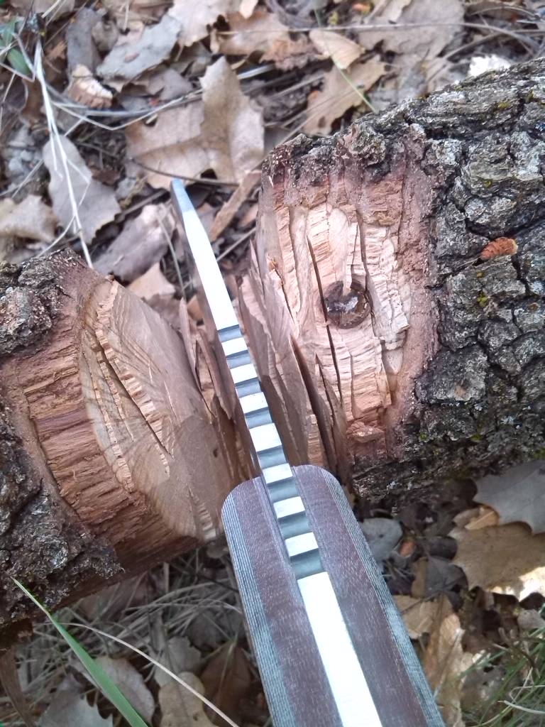 Para ello, aprovechando que había un roble que se había talado con anterioridad y aunque la posición inicial de trabajo era algo incómoda por no poder girar a mi gusto el tronco al machetear me puse a la tarea. El grosor que tomé para la prueba daba la impresión en un principio de ser una tarea dura para solo 12cm de longitud de hoja pero no solo no decepciono sino que me entusiasmó como fue pasando el macheteo, el corte trasversal y el afilado fino de madera.