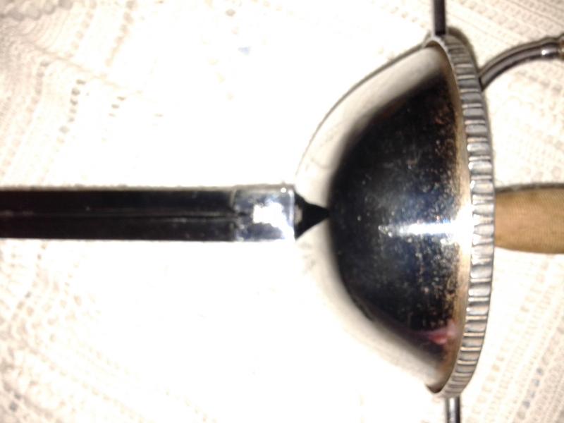 Es una espada tipo ropera, con sello de la Fábrica de Armas de Toledo. Me despista porque el sello puede indicar que se fabricó para el ejército, pero no encuentro información sobre una espada similar, de dotación de ningún Cuerpo, de los último setenta años. Tiene 97 cmtr. de hoja y 32,5 cmtr. de punta a punta de los gavilanes. La funda es de cuero y tiene un botón tipo caballeria.