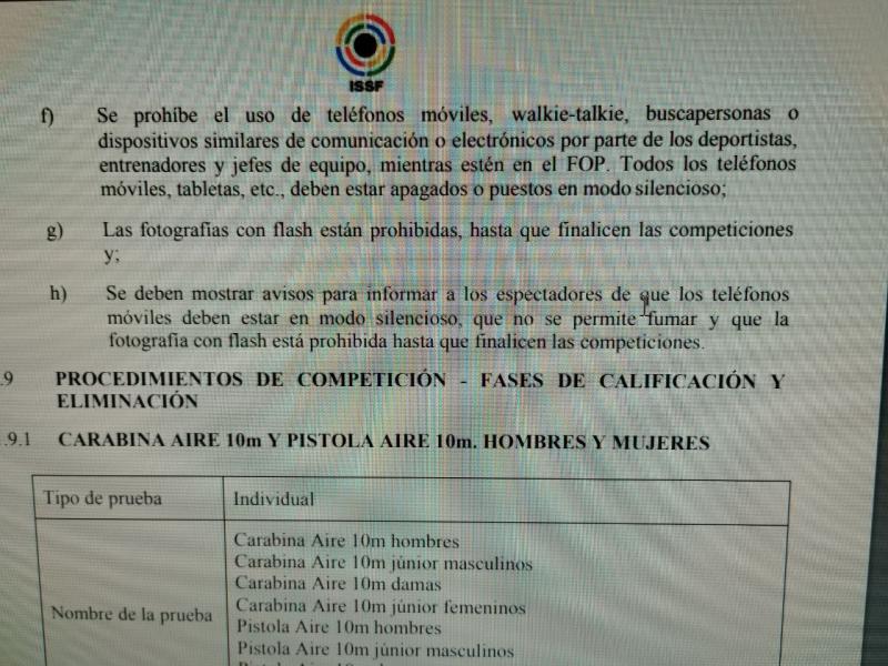 Art. 6.7.4.4 Los deportistas no pueden utilizar en la línea de tiro, teléfonos móviles u otros dispositivos de comunicación portátiles (es decir, tabletas, etc), dispositivos electrónicos o dispositivos de pulsera (es decir, relojes inteligentes).