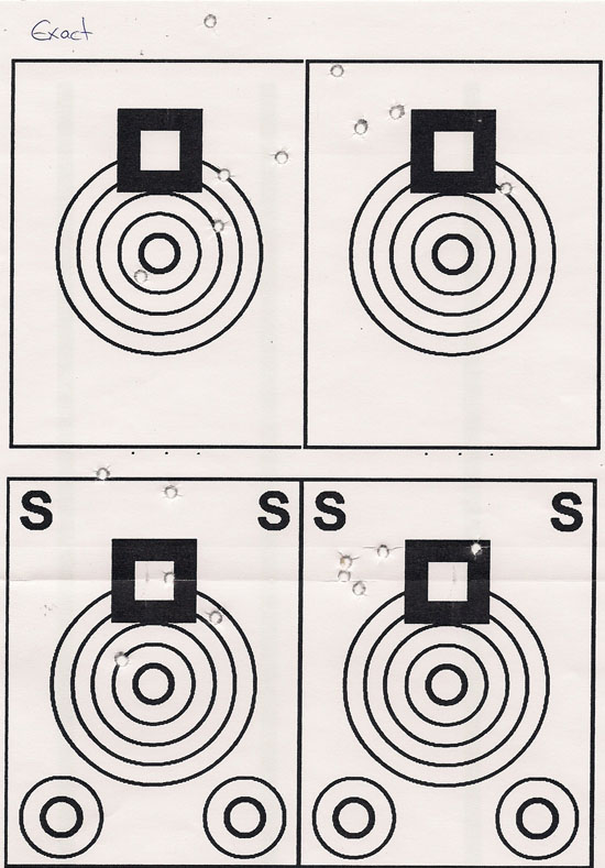en fin, he probado con los barracuda match y power, exact y exact heavy, gamo ts-10, y norica thor, y pongo fotos solo de los barracuda match y ambos exact, que han sido los mejores. he usado blancos de br50 y disparado cinco veces al circulo central.