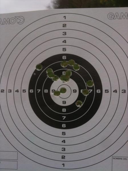 Tengo esta carabina y aún es más precisa que cuando la compré hace unos meses. Soy un tirador mediocre, tirando a malo y esta diana está hecha de pie con miras abiertas a una distancia de 20m. y con balines gamo match del 5.5