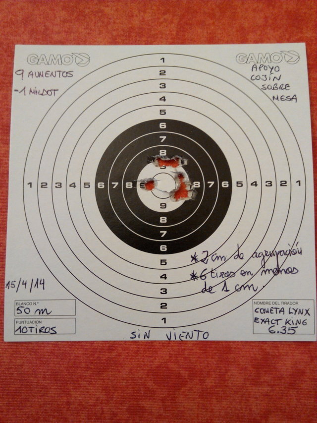 Las agrupaciones que muestro son 50 metros con exact king y cargador mono tiro, con un leapers 3-9x40, hechas a 9 aumentos.