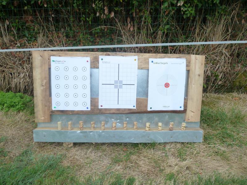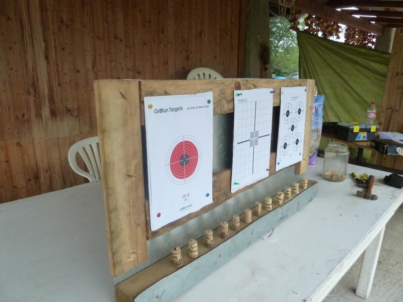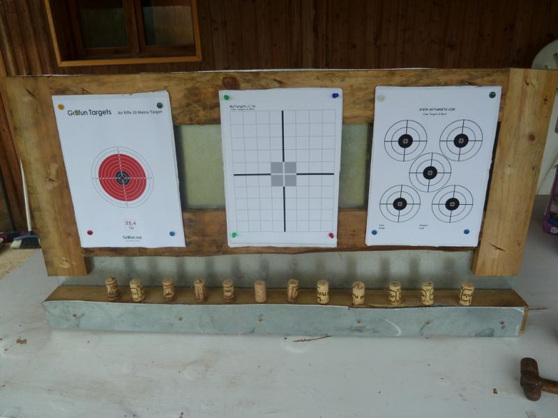 Con lo cual en la parte de arriba tengo: en el centro una diana de ajuste del visor, a los lados dianas normales y cuando acabo de tirar me dedico a los corchos de abajo.