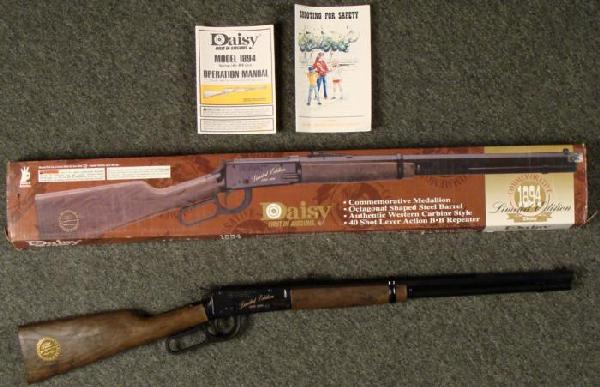 Hola. las Daisy que buscas es la Daisy model 1894, copia de la carabina de W. del mismo modelo. En calibre 4.5 BB y carga por accionamiento de la palanca. Existieron o yo por lo menos conozco dos modelos, el "normal", copia del w. y el denominado edicion del 100 aniversario, 1894-1994 de cañon hexagonal y con un medallon conmemorativo en la culata.